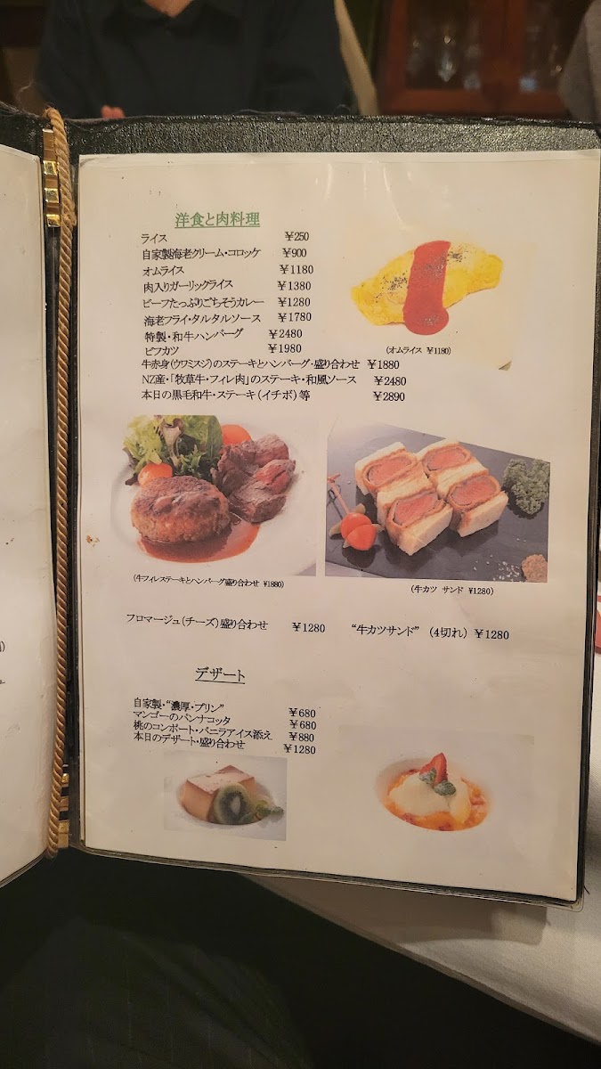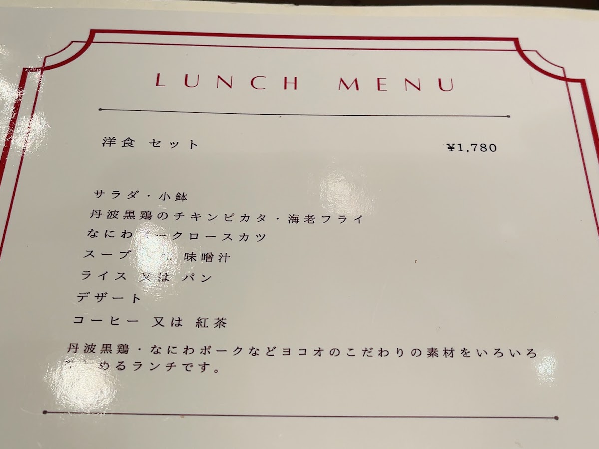 The lunch sets, particularly the 洋食セット priced at 1780 Yen, are a feast for the senses. Diners can indulge in a colorful array of dishes including chicken pita, shrimp fritters, and a tender pork cutlet, all artfully presented alongside a refreshing salad and delectable side dishes like creamy potato salad and savory stewed beef.